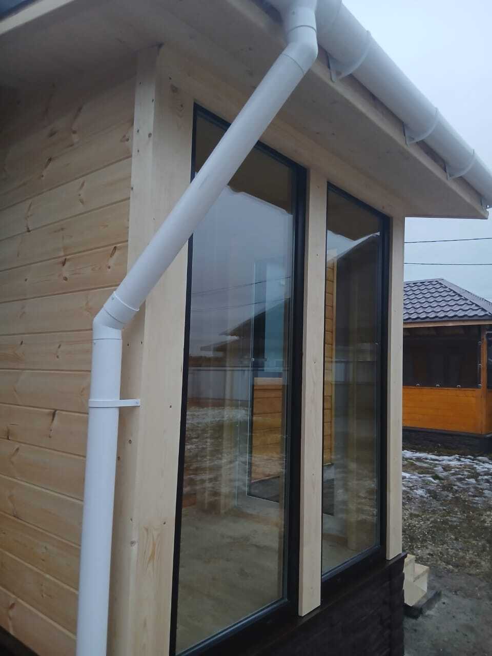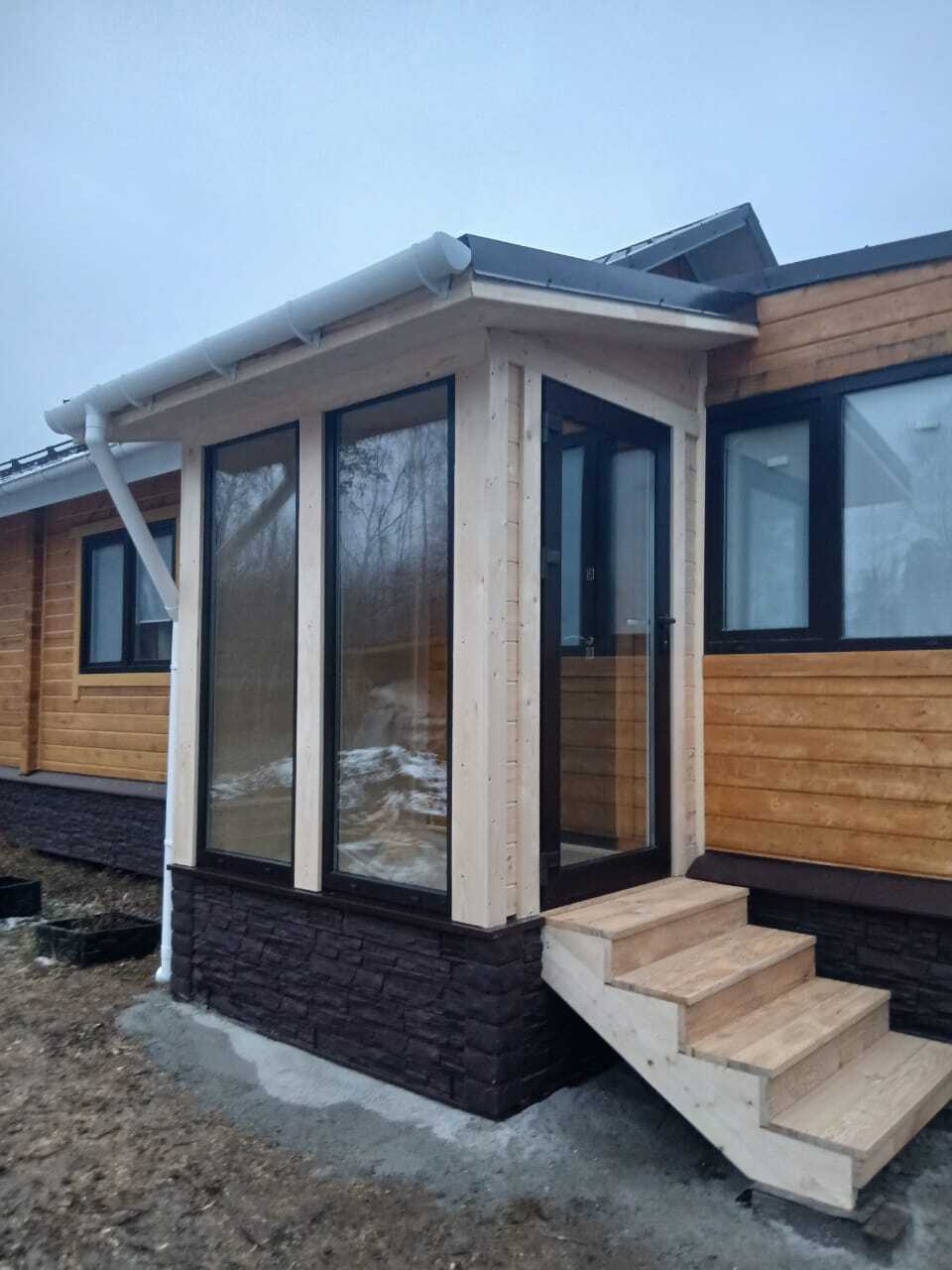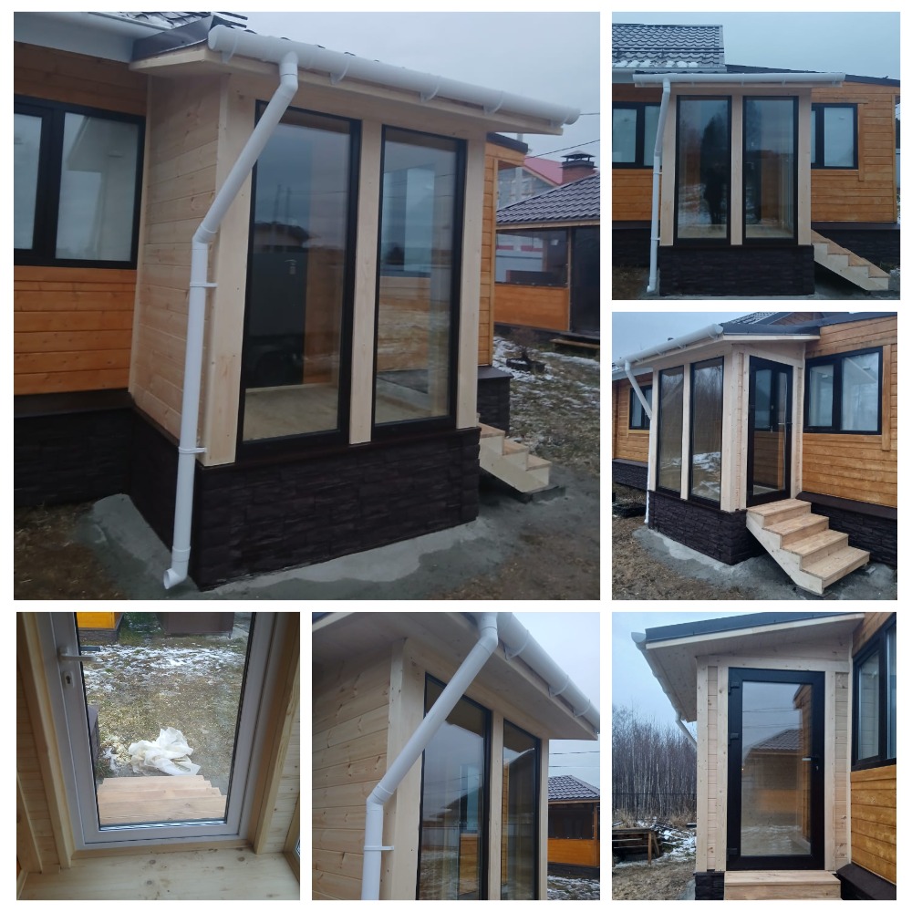 Каркас: доска, ветро-влагозащита, контробрешетка, внутри отделка вагонка штиль АБ, плинтуса наличники, снаружи имитация бруса АБ, на пол доска террасная вельвет