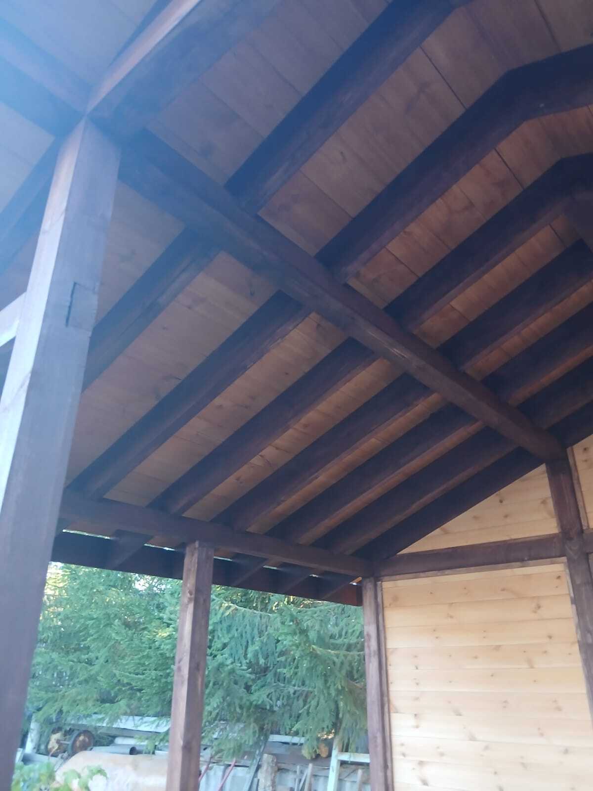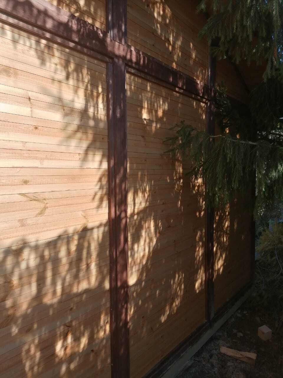 Отделка: Вагонка штиль АБ, 2 стороны полностью. Окантовка бруском 20*40 он дополнительно укрепляет конструкцию, скрывает места крепления вагонки, визуально увеличивает стойки придавая законченность каждому проему.