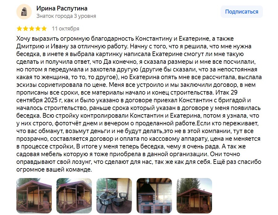 Беседка получилась уютная, комфортная и светлая. Пока работали погода была отличная, это позволило сделать быстро. Ирина оставила нам очень теплый отзыв, так от него хорошо и душевно что не передать.